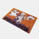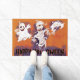 おもしろい10月のハロウィーン屋外の装飾。3人の不気味で不気味なハロウィーンの友人がドアでゲストを迎える。不気味な飛んでいる幽霊とミイラと飛んでいるこうもり。オレンジと紫の装飾要素。ハッピーハローウィン!