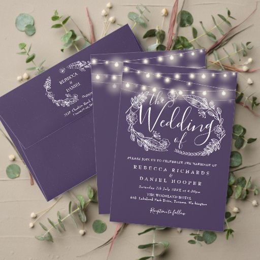 Purple String Lights Floral Script Wedding Suiteデザイン: Thisisnotme Designs