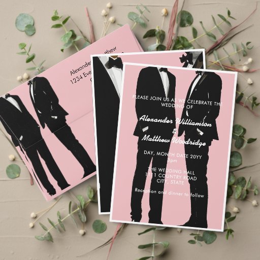 シンプルモダンとエレガント。2人の男性が自信を持って永遠スポーツのの約束と愛の物語を翻訳するタキシード。時代を超越しスタイリッシュた白黒のパレットは、淡いピンク色の背景でエレガントにエレガント補完されている。このデザインは、最新結婚、結婚式招待状、ウェディングプログラム、サンキューカード、披露宴メニュー、カスタムのウェディングデコ救ールなど、の必須要素にシームレスに適用することができる。カスタマイズのサポートについては、remidevandesigns@gmail.com RemideVan©