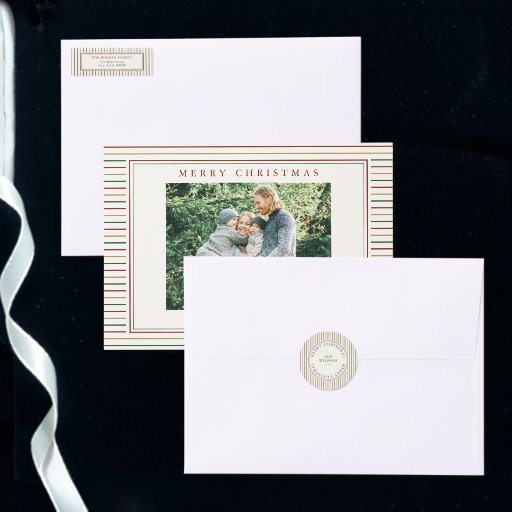 シンプルなストライプの背景に、赤・緑・金のホリデーカラーで、お気に入りの家族の写真と、名前と年を記した、ミニマルなタイポグラフィーをフィーチャーした、オリジナルのクリスマスカードを作成しましょう。 このカードの裏面に、友人や家族への心からのメッセージを添えて。