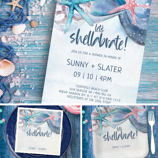 ビーチをテーマにした紙のドリンクコースターは、スレートブルーの手書きスクリプトで「Let's shellabrate」というキャプションと、追加のテキスト行をパーソナライズできる水彩のタマゴガイと貝殻を特徴としています。 アートはKL Stockによる