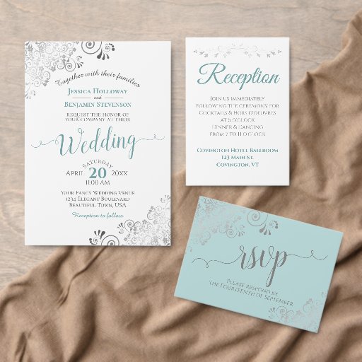 この美しい結婚式招待状はシンプル、ティール(緑がかった色)やターコイズのクラシックデザインと灰色の文字を銀箔フローラと白い背景にフェイク備えている。シックでエレガントデザインでフォーマルも美しシンプルいスクリプトレタリング。