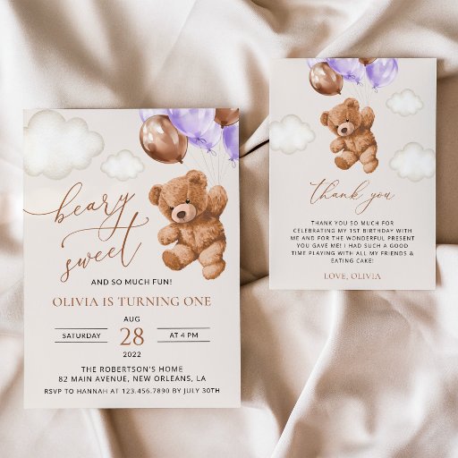 これらの思い出に残るtouchアイテムを誕生祝いにスタイリッシュ追加する個人パーティー!デザインはベージュの背景に紫色の風船を持つテディベアを特徴とする。