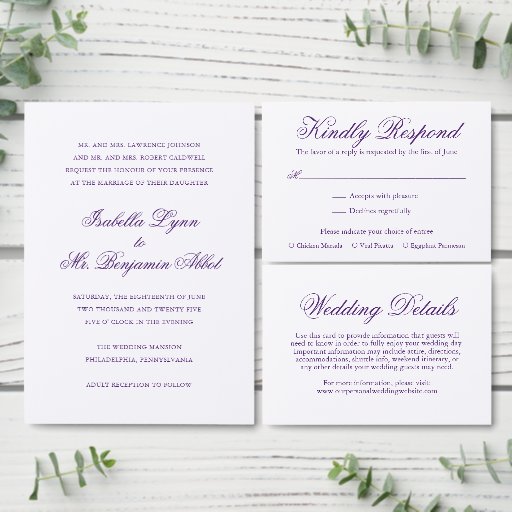 スタイル伝統的のミニチRSVPカードに書のタイトル「親切に応える」を付けエレガントる。すべてのデザイン要素は宝石のトーン王室のパープルで、デザイン編集ツールで変更できる。このクラシックデザインはOSにフォーマル最適結婚である。