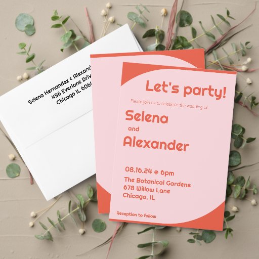 **レトロなピンクとオレンジの鮮やかな色のウェディング** セーブザデート