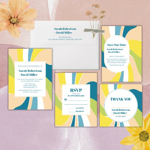 アーチカラフルームテーマ結婚式招待状付きレトロなグルービー波抽象芸術。クリーエレガントム、イエロー、ブルーの色がレトロをテーマにしたデザインに最適な結婚アイテム。このカードは簡単に編集できる。あなたもしは救済、このカードのカスタマイズと必要がある場合やZazzle経由で私に親切にメッセージこのコレクションのためのより一致した製品が必要である。