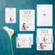ピンク祝の自転車にカップルの水の色のイラストレーションをフィーチャーするこのロマンチックな婚約招待で車輪の愛。このモダンとカジュアルデザインは屋外または国スタイル婚約パーティに最適だ。名カスタマイズ前、日付、時刻、およびRSVP情報を含む文字。ウィムシーのtouchで新鮮で心のこもった発表を望む人々に理想的。