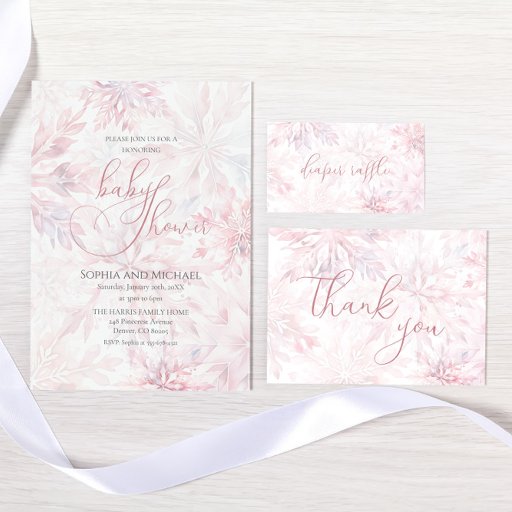 冬のベビーシャワーガールピンクスノーフレーク招待状