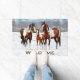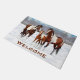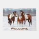 茶色の湾の家族は、冬の牧場で四分の馬に入る。