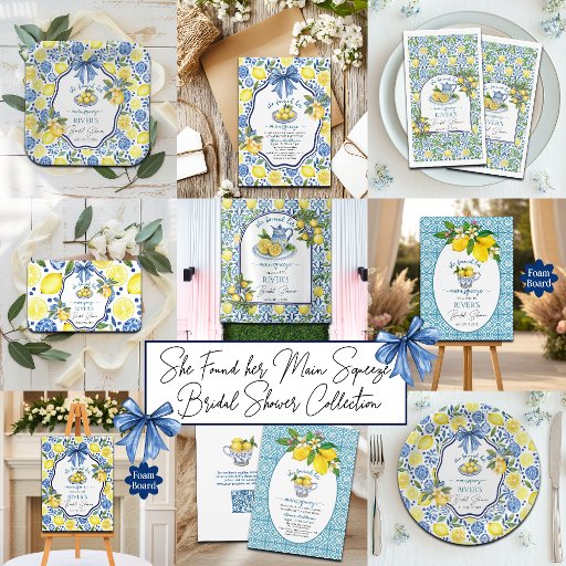 書エレガント跡フローラ青い白いタイルフローラレモンブライダルシャワー招待地中海の瓦レモンをテーマにした彼女は彼女の主な圧迫を見つけた青イタリアン瓦とレモン