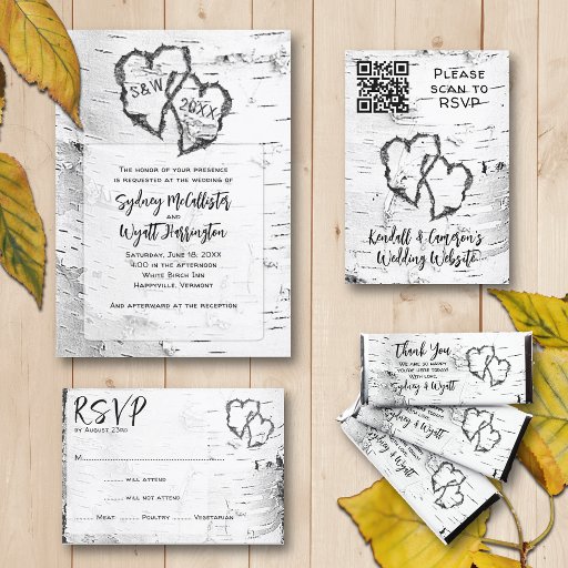 白素朴樺の木、救写真テンプレート – 刻まれたハート付き最新カード。ロマンチックでおもしろい結婚、自然を愛するカップルのための発表。素朴な宛先お祝いと簡単に文字をカードの両側に発表する紙アップグレード。