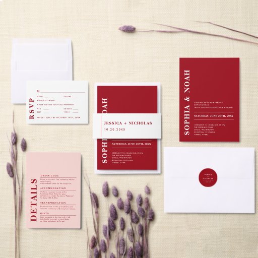 赤モダンエレガント白シンプル結婚の 出欠カード (この独立クリエイターのコレクションをカスタマイズ。)赤モダンエレガント白シンプル結婚の 出欠カード (正面)赤モダンエレガント白シンプル結婚の 出欠カード (裏面)