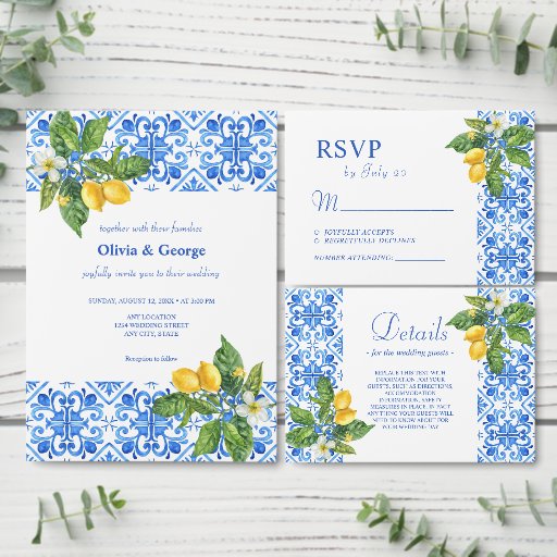 ブルー地中海のタイルとレモン結婚式RSVPカード。