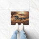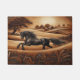 黒い馬が背の高い草の畑を駆け抜け、田園地帯を背景にした。イメージは、複雑なフローラ詳細とダークレザーの表面に刻まれている。
