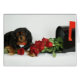 愛らしく黒いおよび黄褐色の騎士は赤いバラを分娩しています。