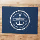 リボンのバナーを持ついかりとカスタマイズ可能な文字「ようこそ」を備えたドアマット。船名を上に追加し、下に寄港を追加する。いかりのまわりにと文字は丸いロ縁どープ。濃い青の背景に白いデザイン。