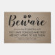 素朴な茶色のバーラップの効果の背景、足のプリントを特色にするおもしろいなヴィンテージのドア・マットはあなたの世帯の犬についてのエレガントな書道のフォントおよびユーモアのあるなことわざで単語"用心します"!