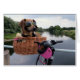 おもしろい犬、橋上のバイクのバスケットのダックスフントの乗馬