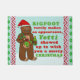 このおもしろいなしゃれの漫画のクリスマスのデザインはビッグフットのにやにや笑うことの写真を示します。 彼はサンタの赤い帽子を身に着けている間花を握りま、ワインおよび包まれたなギフトを運びます。 文字は読みません、"ビッグフットまれに顔を見せます、メリークリスマスを望むために現れられるyetti"。