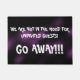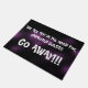 これはことわざを用いる暗い紫色の玄関マットです「私達によってが招かれないゲストの気分にない! 行って下さい遠くにに!!!」 巨大で白い手紙で書かれる。