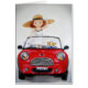小さく赤く変換可能な車の女の子そして彼女の子犬のイメージの空白のな挨拶状。
