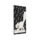 このメタルウォールアートプリントは、白い音符で覆われた黒い背景のピアノ鍵を歩きながら、おもしろいの白い猫がウインクしている。