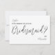 おもしろいおもしろいマーメイドテーマ付きブリデスメイド提案カードカードの正面には、人魚の尾を持つ人魚をテーマにしたタイポグラフィで「私たち人魚は姉妹になる」と書かれている。カードの後ろ読に"[bridesmaid name]あなたが夢中になっている。私の花嫁のメイドになってくれない?プリントとスクリプトを調整航海のしエレガントて[bride name]"このお洒落とユーモアのあるデザインは白黒の私の店からも入手できる。