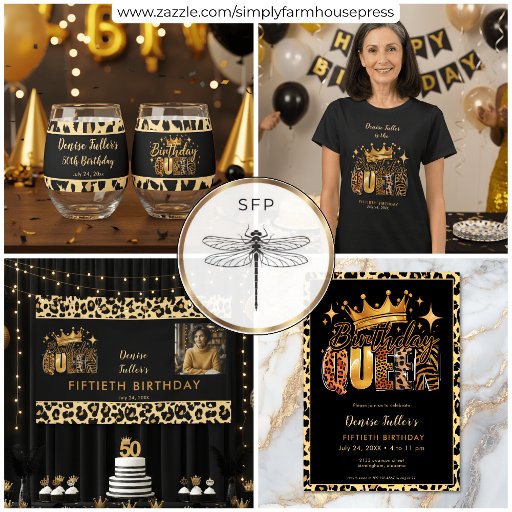 シックモダンでおもしろいの誕生日紙は祝女の中でワイルドな女王をコースター!ヒョウ、タイガー、その他の野生のプリントをブレンドし、この黒、オレンジ、金ゴールドをテーマにしたデザインは、マイルストーンの誕生日に祝おもしろいの方法である。Simple Farmhouse Pressによって作成。