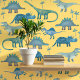 おもしろいの青と緑の恐竜が晴れた黄色の背景に見える。ティラノサウルスレックス、トリケラトプス、ディプロドクス、ステガサウル、スピノサウルス。子供の子供部屋、寝室または遊び場に最適。オリジナルアートby Nic Squirrell.