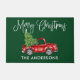 おもしろいモダン書道台本の水色ヴィンテージレッドトラックとクリスマスツリードアマット – 森の緑の背景