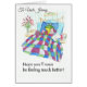 Get Wellカードをパーソナライズするには、緑のカエルと、ベッドの中で温水のボトルと薬、ブドウと花のまわりにを、彼の手のイラストレーションから彼の中に横に色彩の鮮やかお洒落。