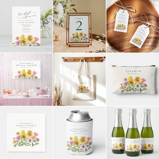 ガーデン結婚前お披露目パーティー招待状ボタニカルトレンディなボヘミアンデザインかわいらしい美しいイラスト夏のひまわり黄色とピンクと桃色エレガントな筆記体カリグラフィータイポグラフィー水彩花卉予算