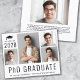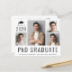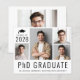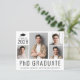 お手頃でモダンな博士課程修了お知らせカード。4枚の写真を並べたコラージュが特徴で、底部には「博士課程修了」が大きな大文字で、クラス年度、名前、大学名がシンプルなタイポグラフィーで表示されます。裏面には、追加の写真と個人メッセージを追加できます。