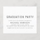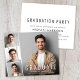 リーズナブルでモダンな卒業発表とパーティー招待状。卒業生の写真に3枚の小さな四角い写真のストリップが重ねられ、「卒業生、」名前、学校、卒業年度がシンプルな白いタイポグラフィーで表示されます。パーティーの詳細は裏面に追加してください。