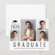 お手頃でシンプルなモダンな卒業発表。4枚の写真のコラージュを採用し、大きく「卒業生」と書き、卒業年、名前、学校または大学を簡単なタイポグラフィーで表示。