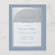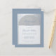 現代的なリハーサルディナーの招待状。ほこりブルーの長方形の背景に、偽の銀の箔のアーチがあり、その中には白い背景にほこりブルーの文字が入っています。「リハーサルディナー」と名前は、優雅なカリグラフィーで書かれており、最初の行はアーチ状のテキストです。