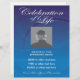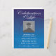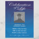 カスタム写真の記念お祝いの美しい青い背景の上に生命の招待フライヤーと円を描く。日付、時刻、場所など、完全にカスタマイズ可能「カスタム写真はこちら」のテンプレートを、名誉ある人物の自分の写真に置き換える。人生のイベントのお祝いは、共有の思い出に素晴らしい方法であり、葬儀サービスに加えて、または葬儀の代わりに、家族または友人に敬意を払伝統的う。
