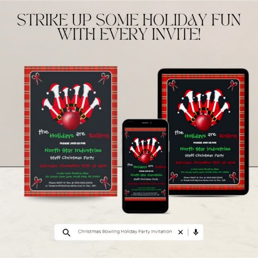 このフェスティブなホリデーボウリングパーティーの招待状は、赤いグリッターのボウリングピンと、雪の結晶のパターンが入った赤いボウリングボールが、陽気な赤い格子縞の背景にデザインされており、季節の楽しみとパーティーの喜びを広めるのに最適なデザインです。
