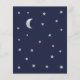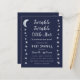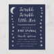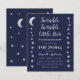 星と月が左右の境界線にデザインされた、ベビーシャワー用の招待状。背景はネイビーブルーで、テキストはライトグレーとホワイト。タイトル"Twinkle Twinkle Little Star"と名前は、ゴールドの手書きスクリプトで書かれており、"Twinkle"の言葉のiの上に小さな星がある。 裏面には星と月だけがデザインされている。