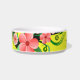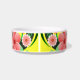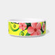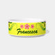 ©サニー火星デザイン。トロピカルハイビスカスの花の黄色、ピンク、緑のフローラデザインを特徴とする、かわいい可愛らしい小さなペットフードやウォーターボウル。犬や猫の名前を付けてカスタマイズする。