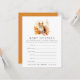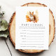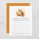 ベビーリスの水色のイラストレーションをオレンジ、赤、黄色の色合いの紅葉に囲まれてカードの上部に配置された可愛い赤ちゃんシャワー推測ゲームカード。カードをカスタムカスタマイズする説明書、推測基準、および母親名と赤ちゃんシャワーの日付。このデザインは可愛いウッドランド動物の赤ちゃんシャワーのコレクションとコーディネート。