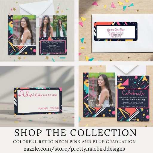 レトロ鮮やかな卒業記念差出人住所ラベルで80年代の世界にインスパイア入り!深いネイビーブルーを背景に、ネオンピンク、電気ブルー、ライムグリーンの型枠抽象芸術の姿が当時の象徴的な美学を彷彿とさせる。80年代の色が我々と一緒に感動とノスタルジーを燃やせ来て、価値のあるマイルストーンを祝う祝!