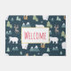 フェスティバル模様のウェルカムドアマお洒落ット。シロクマ、トナカイ、木。キツネ、雪片。濃い緑の背景で