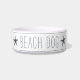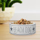 あなたのビーチハウスやアイランドハウスにぴったりな、かわいいコーストスタイルのドッグボウルです。スモーキーなハーバー青のファームハウススタイルの文字で「ビーチドッグ」という文字が、白い背景に細いネイビーのストライプとヒトデのアクセントでデザインされています。