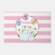 ピンクと白の背景を持つウェルカムドーストライプのマット。テキストを内側に配置し縁どた上にピンクの層を持つ白い円形フレーム。フレームの中にイラストレーションママとベビーバニーが一緒に立っている。背景に黄色のデイジー。蝶がお洒落飛び回る。