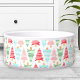 白い背景にピンクとパステルのクリスマスツリーを特徴とするクリスマスペットドッグボウル。 – ケイト・エデンアート