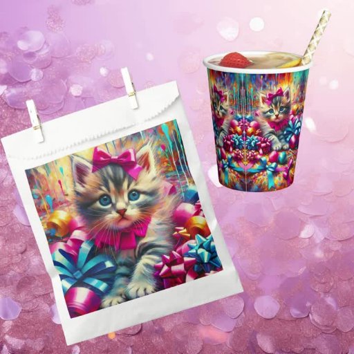 ピンクとブルーの女の子の誕生日パーティー紙プレート。弓とリボンで遊かわいい誕生日の子猫。ピンクカラフルとブルーaiアート。