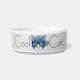 このライトグレーのキャットボウルは、黒い眼鏡を掛けた非常に子猫のイメージでクール設計されている。「猫」はクール黒いフォントでシンプル設定。青と緑のグラフィックの前に「クール」という言葉を置きお洒落、グラフィックの後に「猫」という言葉を置く。背景は非常に薄いグレーでアクセントと興味を追加する。お宅の猫にぴったりの食べ物やクール水の皿!