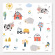 可愛い飼育動物キッズパターン壁紙は、トラクターやリンゴの木や赤い納屋を持つ牛や羊などの可愛い飼育動物を特徴とする。完璧な子供へベッドルーム、子供部屋の装飾、プレイルーム、ホームデコール、オフィスとパーティーの装飾。Evco Studio www.zazzle.com/store/evcostudioによって作成