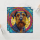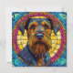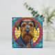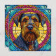 濃くて濃い髭と表現豊かな目を持つ犬のポートレートで、黄色、ピンク、青い色合いのステンドグラスのような背景で囲ま鮮やかれている。